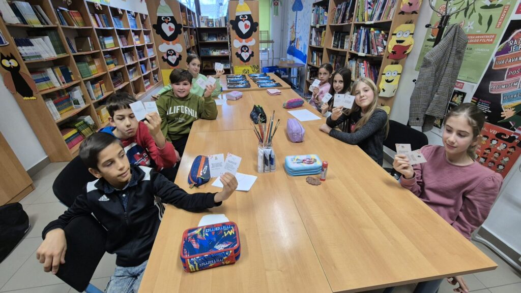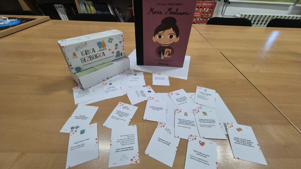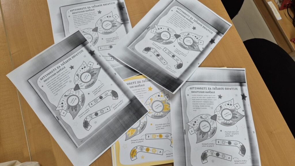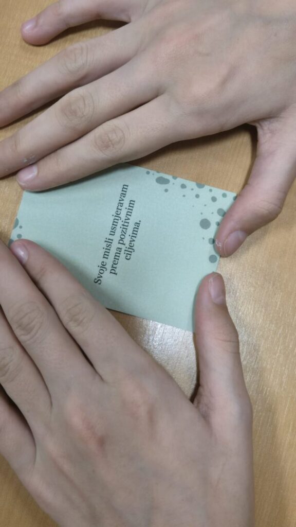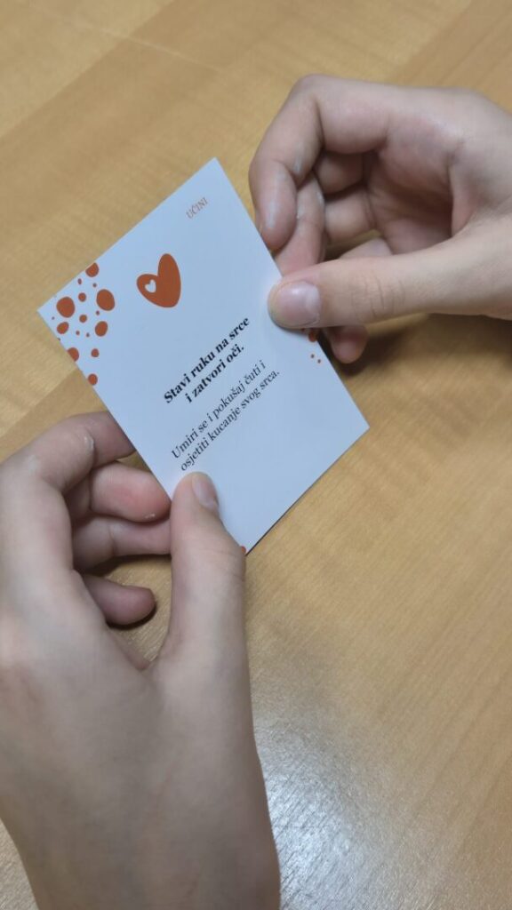 Nakon razgovora, učenici su sudjelovali u raznolikim aktivnostima iz igre Kartice bezbrigice, kroz koje su istraživali vlastite osjećaje i vježbali empatiju kroz pokret i igru. Izvodili su vježbu “Krila leptira”, u kojoj su povezivanjem stopala i laganim podizanjem koljena poticali smirenost i osluškivanje vlastitog tijela; “Zagrljaj za sebe”, nježan i kratak zagrljaj usmjeren na jačanje osjećaja sigurnosti i brige o sebi; te “Ogledalo emocija”, u kojem su promatranjem svoga odraza pokušavali prepoznati i razlikovati različite emocije. Poseban smijeh i veselje izazvala je vježba “Kokica skokica”, gdje su učenici izvodili lagani čučanj i skočili u zrak poput kokice koja puca, potičući pri tome razigranost i slobodu pokreta.
