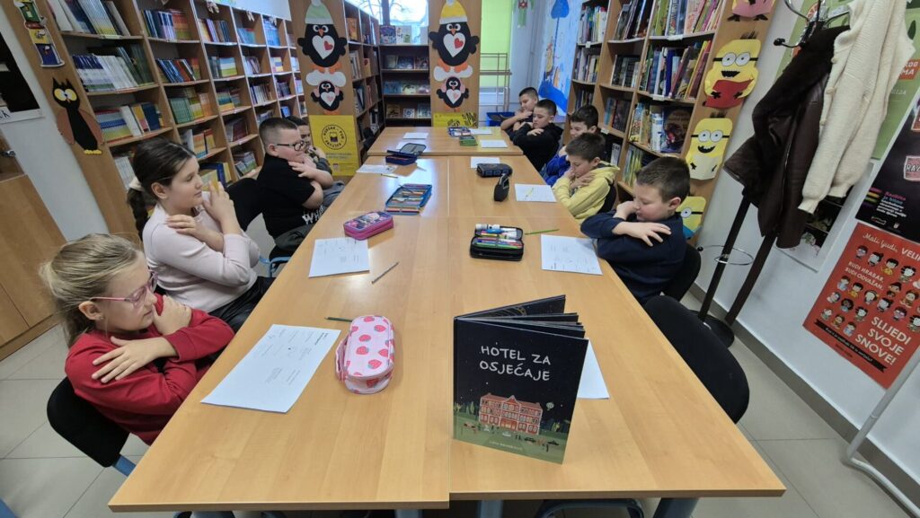 Knjižničarka je učenicima pročitala slikovnicu Hotel za osjećaje, čija je autorica i ilustratorica Lidia Branković. Nakon čitanja uslijedio je razgovor o dojmovima – što im se najviše svidjelo, koja je glavna tema priče, tko su glavni likovi te koji im je bio najdraži trenutak. Djeca su se posebno oduševila toplim i maštovitim ilustracijama koje na nježan način prikazuju različite emocije.