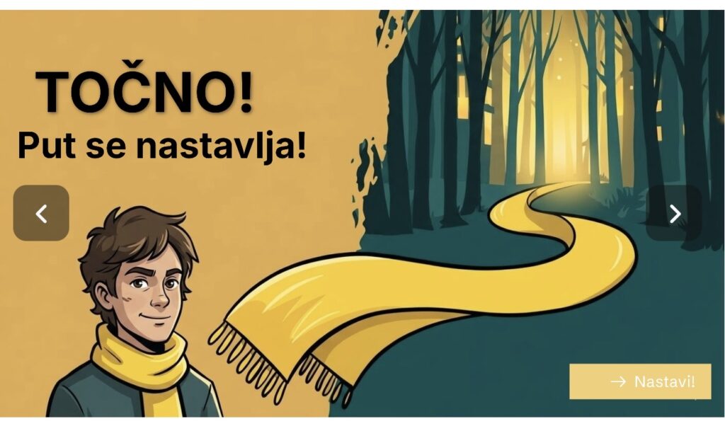 Učenica Dorotea Mrkonjić osmislila je odličan online kviz u programu Genially za knjigu „Žuti šal”. Svojevrsni “escape room” kviz, potraga koja te vodi do glavnog motiva knjige.