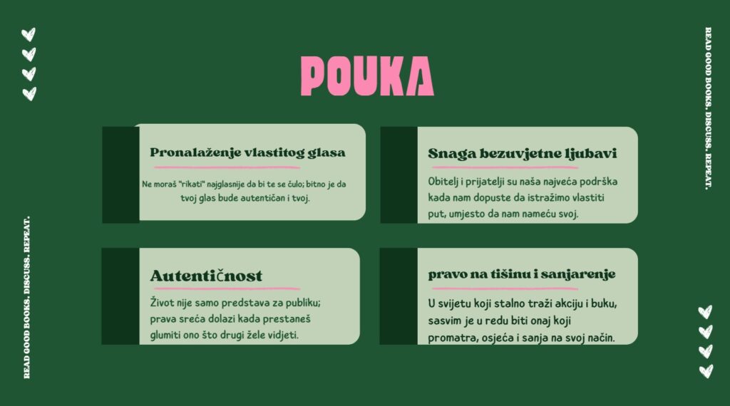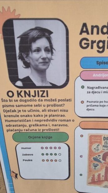 Jasmina Velagić pripremila je zanimljivu PowerPoint prezentaciju o knjizi „Dragi ja iz prošlosti!“ https://canva.link/1wuzshu12t5pgbj; a Matea Šimić kreativan plakat za knjigu „Sutra ću biti dosadan kao pas“. Pogledajte samo kakve je sjajne poruke istaknula učenica Jasmina. Životne, mudre, metaforične poruke. Slažete li se s njima? Izvrsno, kritičko promišljanje učenika još je jedan dokaz svrsishodnosti ovoga projekta.