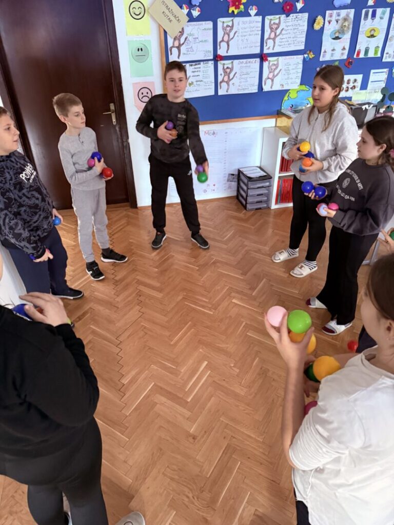 Na satima hrvatskog jezika učiteljice Tamare Gutić Filipović redovita je uporaba neobičnog, ali vrlo zabavnog nastavnog pomagala – loptice skočkice. Iako naizgled jednostavna, ova mala šarena loptica postala je pravi alat za komunikaciju, suradnju i vrednovanje na satu.