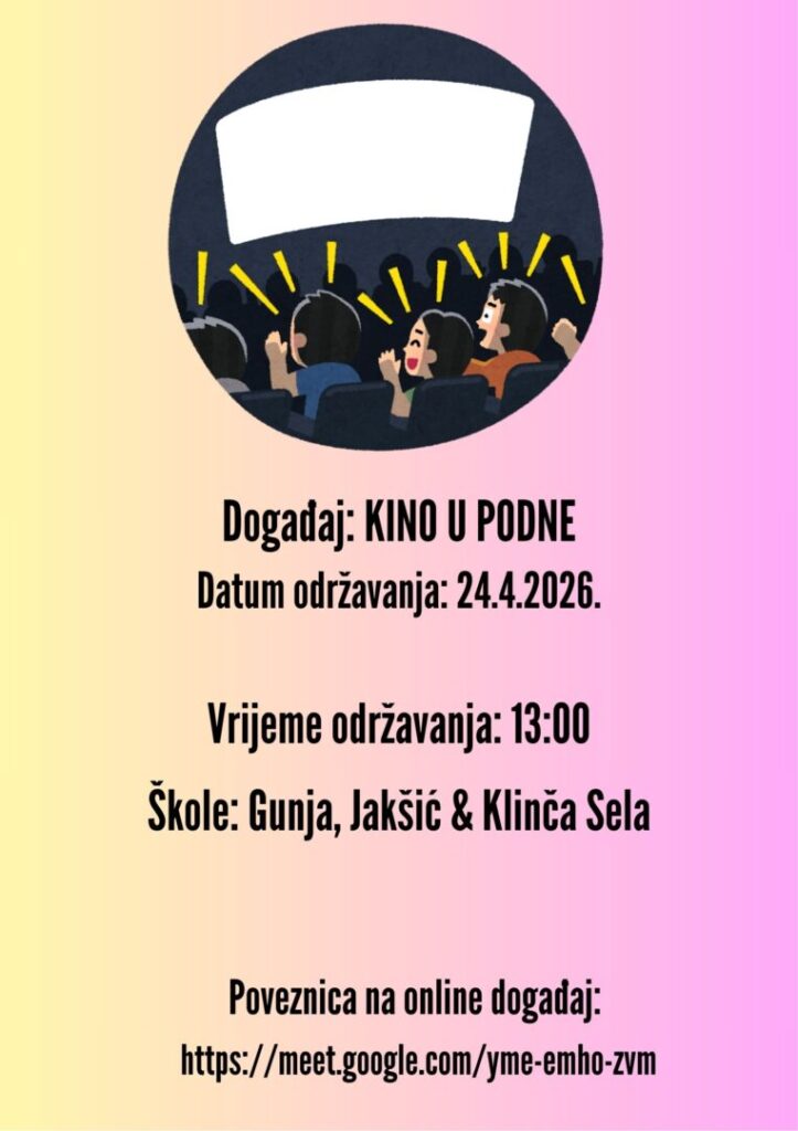 Povodom obilježavanja 9. Dana medijske pismenosti, 24. travnja 2026. godine u 13:00 sati održan je online događaj „KINO U PODNE” u organizaciji voditeljica filmskih družina: dr. sc. Anite Tufekčić (OŠ „Antun i Stjepan Radić” Gunja), Marije Jukić Rogač (OŠ „Mladost“ Jakšić) i školske knjižničarke Sanje Šušnjara Raić (OŠ Klinča Sela).