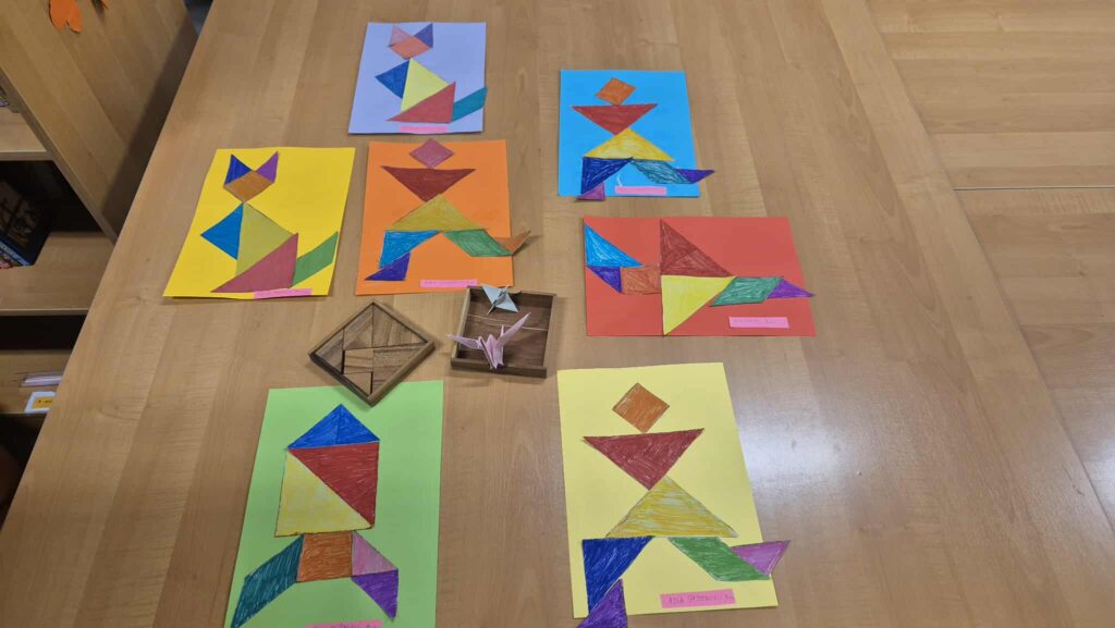 Cilj radionice je razvijanje logičkog i prostornog mišljenja, pažnje, suradnje i kreativnosti kroz slaganje Tangram oblika.